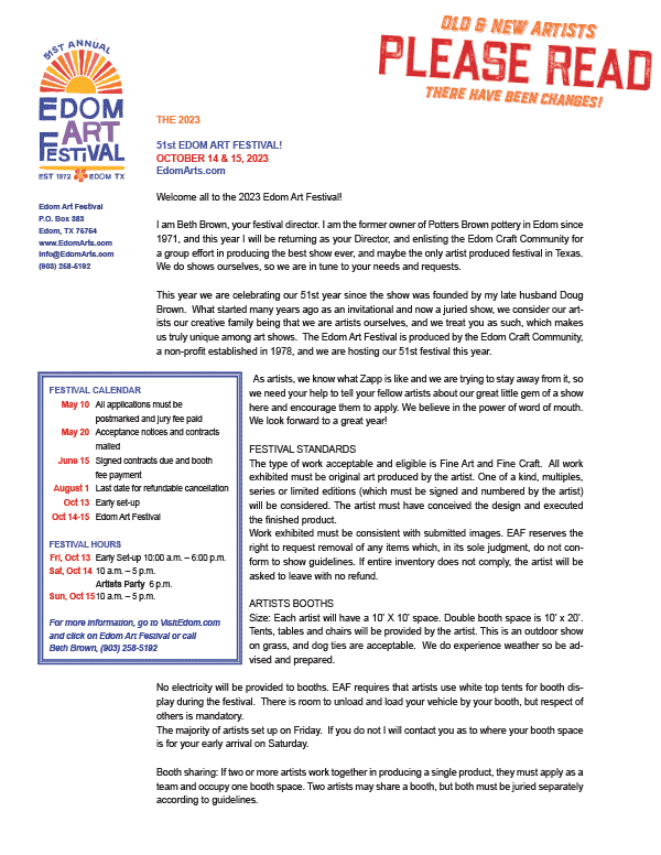 Email four (4) digital images of your current work and one (1) of your booth display images must be sent via email to: info@edomarts.com